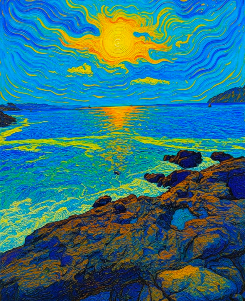 The sunset was good but not as fabulous as predicted, so some artistic licence was required to show the last rays of sunshine setting over a very grubby lido. The natural Saharan embellishments, embellished by using some arty AI digital tweakments.