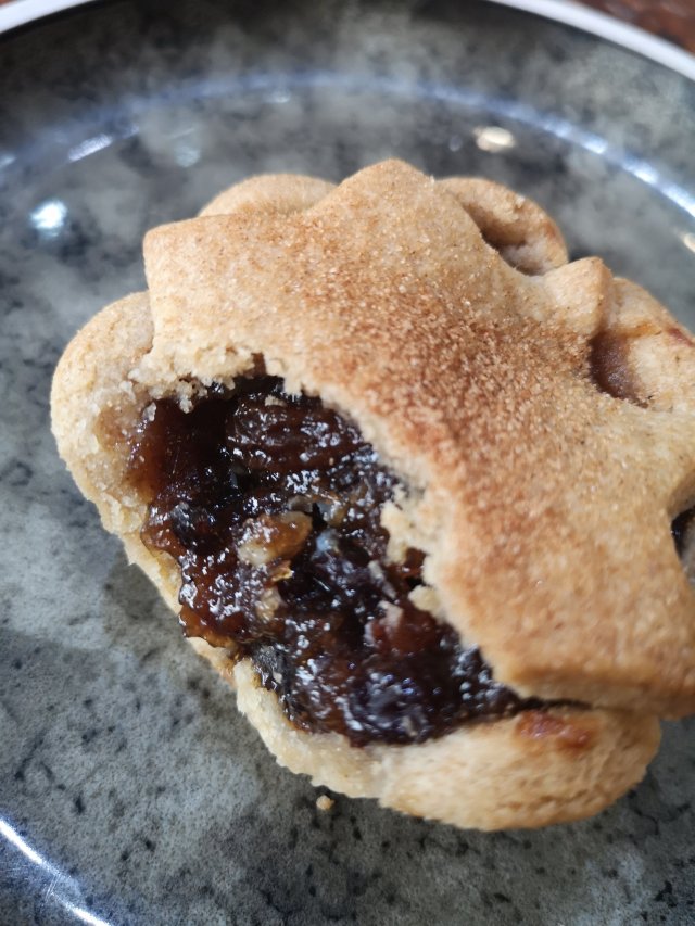 Bakery made Stollen , as far removed from the supermarket stuff as it is possible to be. A generous core of deep yellow marzipan surrounded by jewel fruited,doughy loveliness , gently dusted with icing sugar. The mince pie, no less lovely, had a deep, golden pastry case filled with dried fruits, quenched to plumpness and topped with a pastry star.