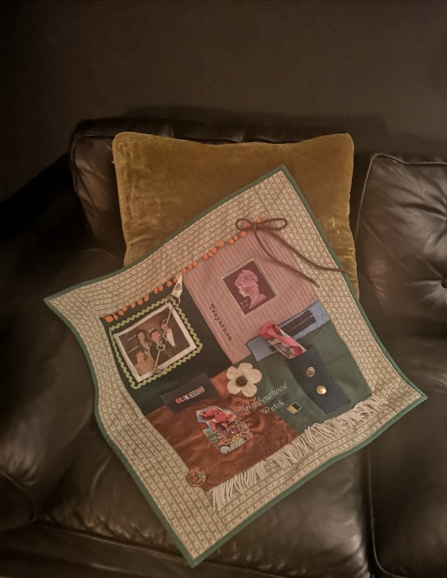 So much more than stitchery goes into every creation. Mrs Marvellous has had personal experience of both dementia and loss, but beyond that she is involved with Plymouth Dementia Action Alliance. She says Plymouth is a hotspot of dementia innovation and research. She advocates the need for protection of pride, respect and dignity for those living with dementia. Her lap quilts and aprons are designed to keep people warm and engaged, with pockets, textures, familiar fabrics, perhaps samples that are representational of their old life and loves. A brilliant techy addition to the magic of the creations is a tag sewn into its own pocket.