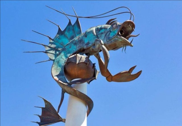 The Leviathan is a prominent sculpture, by Brian Fell, situated on The Barbican Plymouth. Locally it is known as the Plymouth Prawn . The Leviathan is set to become famous Worldwide as the Mayflower400 celebrations build up in Plymouth. The Leviathan is close to the commemorative Mayflower Steps.Leviathan has its own Twitter account , not that it’s particularly active or has many followers. Strange really. Leviathon lives in a lively location.