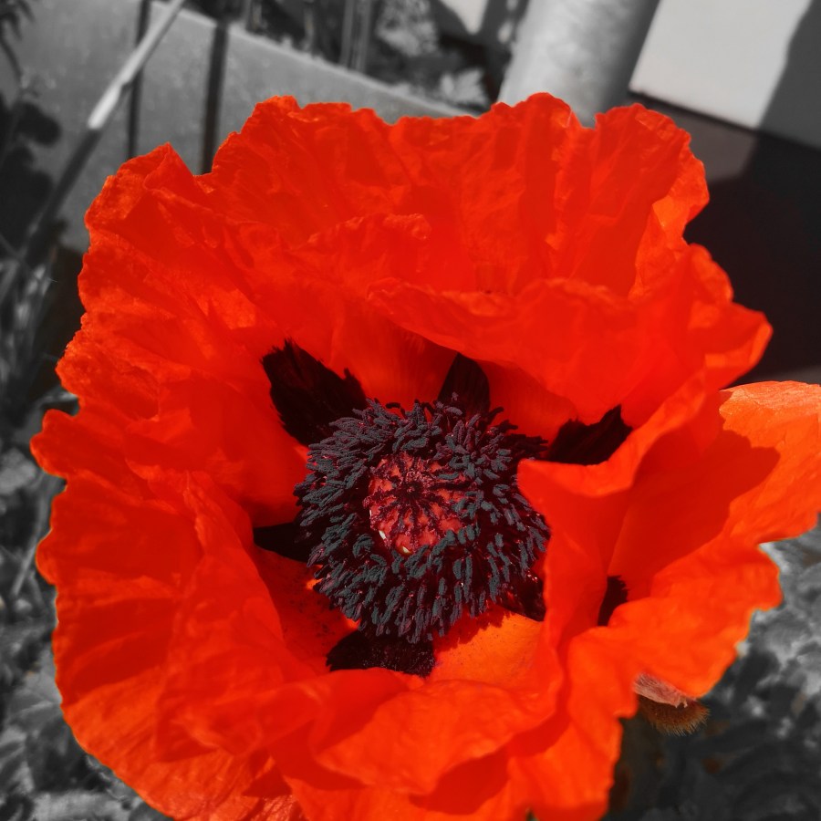 We planted a mix of Oriental Poppies and Field Poppies on the rough ground to mark 100 years since the end of WW1. The land is opposite the village War Memorial.The rough ground is not officially ours but it is the entrance to our back garden. For many years it was the responsibility of the local council to look after it. It is a sad little triangle of land planted with actual road signs. It also bears the posts of old Street furniture and the droppings and scrapings of many years of road surfacing contractors left over cement and tarmac. With Austerity the council has abandoned it. As a growing space it has a mixed aptitude, in the spring it does beautifully with miniature daffodils . In summer weeds do particularly well but so do the poppies. At a high point, it slopes quite steeply up a hill, we have created a little garden between abandoned curb stones and an old but hugely fecund ash tree. The garden like the rest of the triangle is somewhat picky on what it will grow. Currently it supports a very old climbing rose from Hannah’s parents garden. A Christmas tree from a broken home who needed somewhere to rest his roots, some vivid geraniums, a glorious helibore and a few bright Heucheras.Attempts at introducing other things have failed , not exactly expensively, but disapointingly.This week’s Lockdown outdoor project is our annual chore of taming the wild space for the summer. We’ve not quite finished but it was a great reward to have this beautiful poppy this morning.And then there were two.