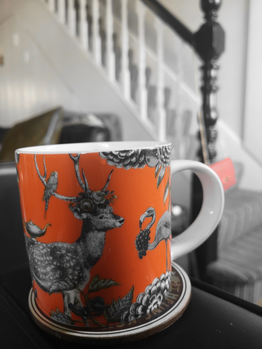Early on in the pandemic lockdown I felt the urge to wear it. This was in April , not a month that usually sees this shirt out and about. Pre pandemic along with the shirt there were little pops of orange in our lives. This beautiful mug and the handbag hanging on the Newel post are by my elbow as I write.