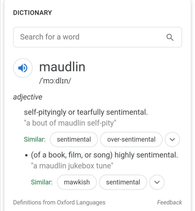 I have no idea when I last thought or said the word ‘ maudlin’ . I even had to look it up to check I wasn’t being inaccurate in its use.