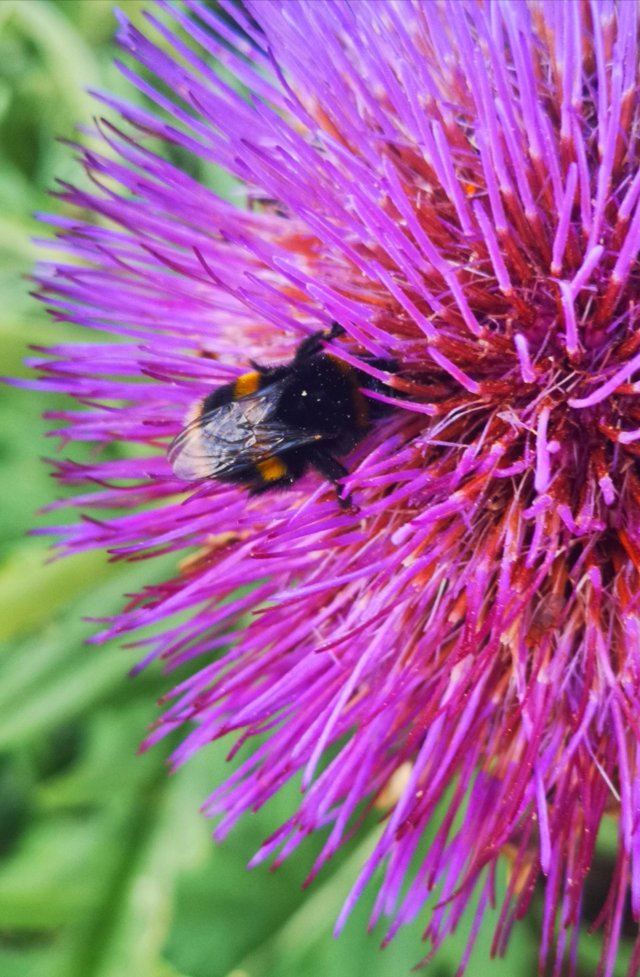 Today is the day in our corner of South East Cornwall. The Artichokes have burst forth their pollen coated flowers and bees are all over the place, apparently this is a buff bottomed bee. There were many bees of buff bottom fame.
