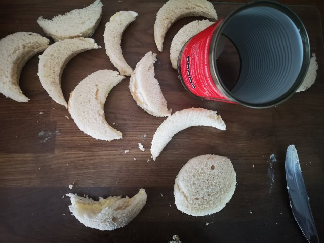 Stage one cut a circle or full moon out of one of the sandwiches, repeat as necessary with the other sandwiches……………………………