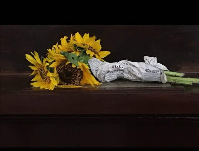 This is another favourite, a sunflower next to a table light , artfully abstract, I like it but I don’t love it.Adoration, loyalty and longevity are the symbolic meanings attached to sunflowers in Western culture and in China good luck and lasting happiness .In Cuba, where my favourite picture was taken, the sunflower has a unique cultural significance. The sunflower is offered to the Virgin of Charity or Cachita as the mother of Jesus is informally known. Digging a little deeper the offering of sunflowers is a fascinating blend of worshipping girl power. In the Afro- Cuban belief system that is part of the Yoruba based religions, sunflowers are offered to Oshun who is an Orisha or spirit. She is a river goddess associated with divinity,feminity, fertility,beauty, freshwater, wealth and intimacy.The Virgin Mary in Cuba is habitually wearing a dress of sunflower yellow.Who knows why these flowers were left in a church, one of the many reasons I love this picture is the unpretentiousness of the bunch of flowers and that the imprint of the person who left them is still seen in the crumple of the newspaper used to wrap them.