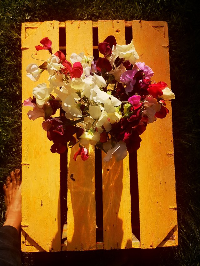 I also tried another ‘flat-lay’ with the Sweet Peas, the orange painted 🍊 box and inadvertently my foot.