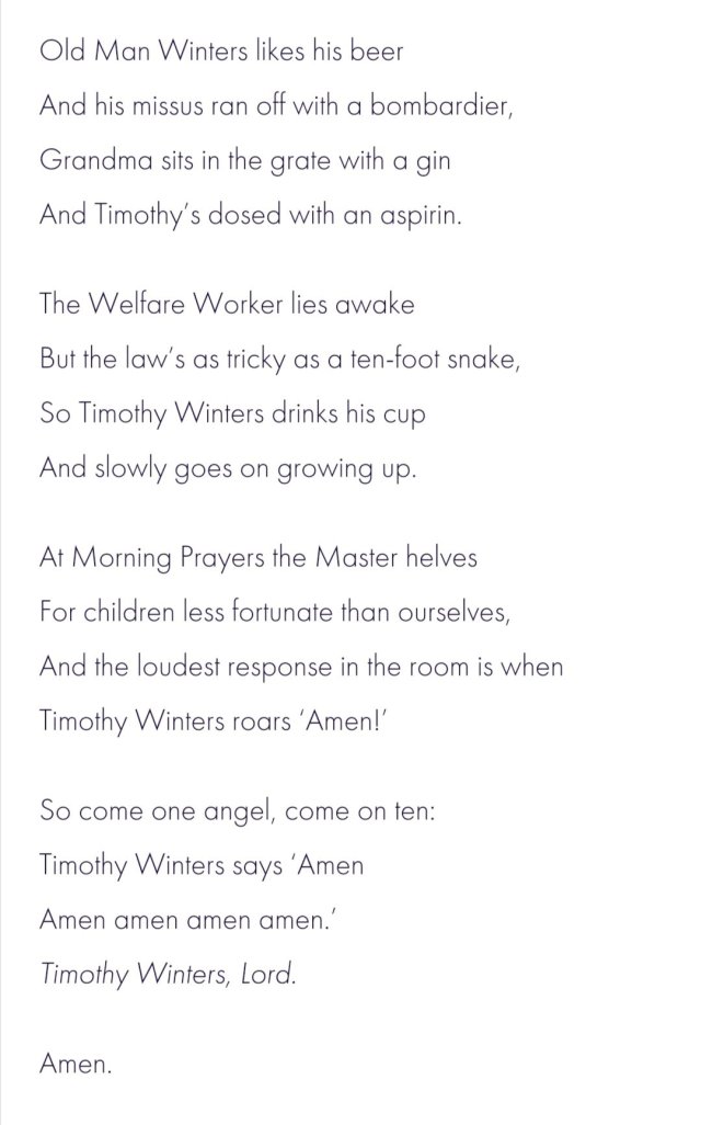 Charles Causley is a poet that attracted me as soon as I met his poems.’ Timothy Winters comes to school with eyes as wide as a football-pool’My first experience and a memorable first line. The rest of the poem is beautifully descriptive in an ugly way.