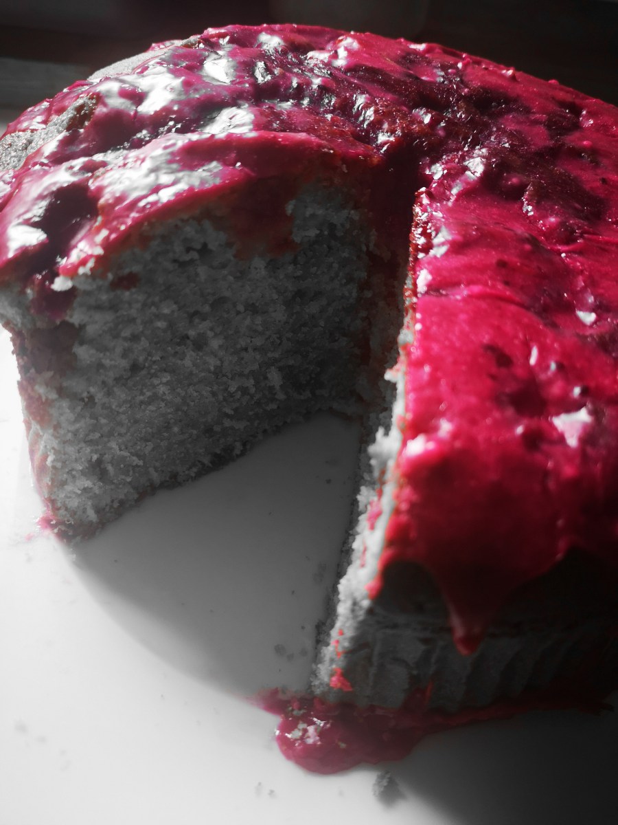 Todays cake is the most bodacious looking . Puce pink icing and deep blacky purple drizzle. It would be wonderful, but the small amount of blackcurrant juice added to the cake mixture has changed the colour of the cake just slightly bluey green. Useful for a sea monster but not so lovely for afternoon tea style cake.