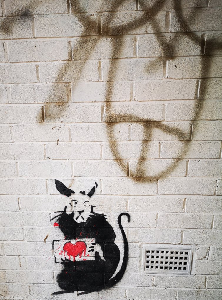 Googling ” is this a Banksy?” takes us down another rabbit hole, although, of course, rat run would be more appropriate. My mind is caught up in a trail featuring a Michael Shuman who , perhaps, created this graffiti and claims to have had his identity stolen by Banksy who is of course anonymous. Is it even possible to steal an identity if you are anonymous. The rudimental dickpic above the rat is unsigned. Let’s just leave the whole conversation there.