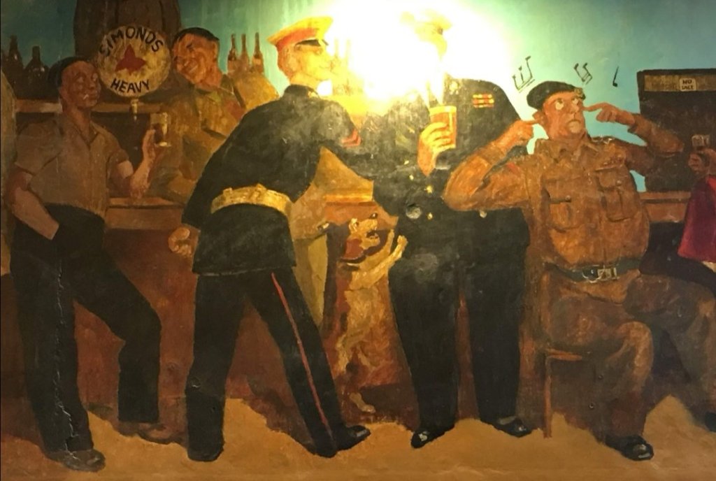 The artist, who created the mural, Vincent Bennett took the well- worn path, familiar to many creative Plymothians and moved to London at the age of 20, where he not only painted commercially, but also boxed, to earn a living. It was the boxing that caused him to return to Plymouth just two years later. A head injury forced him to return to his home city in 1932 and he added teaching and drumming to his portfolio of money earning skills. Eighteen years later he painted the mural at what was then called the Sydenham Arms.