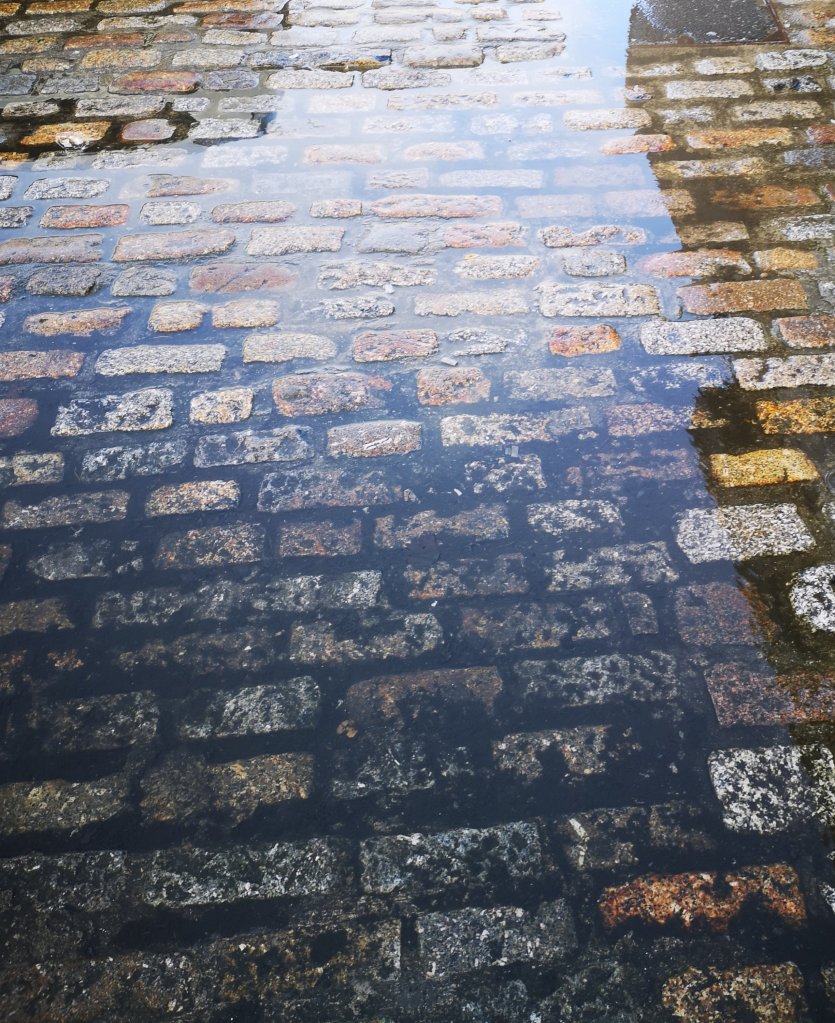 Some days we commit to a dog walk regardless of the weather. Yesterday’s was a case in point. Our regular circular walk around Sutton Harbour in Plymouth was tied into the day by some chores that also needed to be achieved. Once the chores were done the weather had taken quite a turn for the worse, our walk from Commercial Street to the Barbican was definitely the sort of walk where you spend more time looking at your feet with your head lowered against the ice cold needles of rain. Pondering my feet as a distraction against rain gave me the topic of this particular walk. The Barbican area of Plymouth has more cobbles than any other area of Britain.