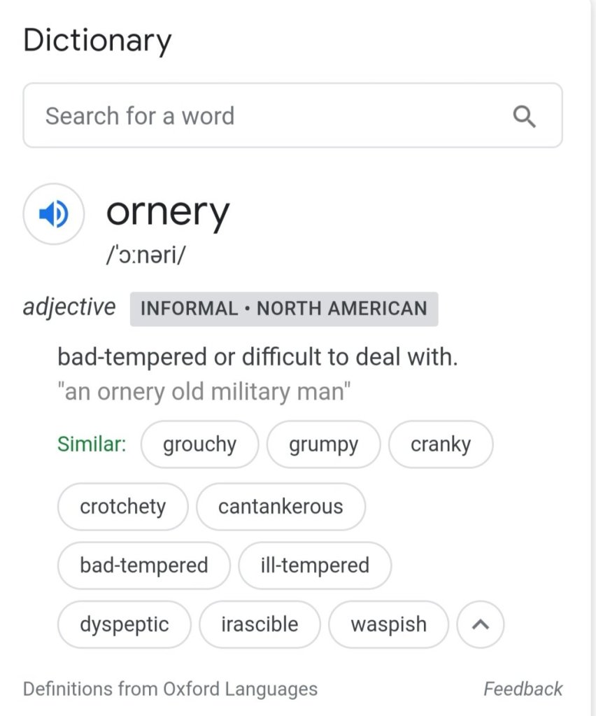 Liberated! The minute I felt slightly dyspeptic, crotchety or even waspish about President Trumps’ shenanigans this week I whipped out ‘ornery’, if Claudia can use it in public without humiliation then so can I!