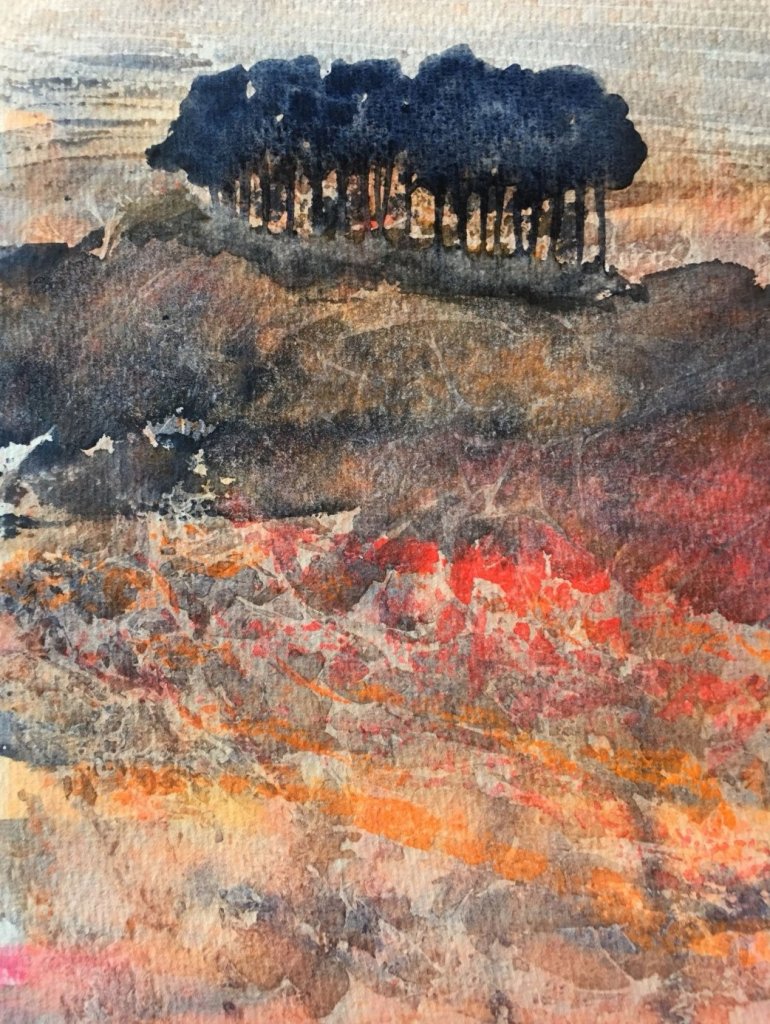 Watercolour landscapes, a fine way to relax and experiment a bit. As a holiday activity it is unequalled, although many of mine are not truly watercolour as it is all too easy to dip a brush in my gin and tonic in error. This last watercolour will feature in tomorrows blog too, as it is a painting of the ‘Nearly There Trees’ a famed Landmark on one of the routes into Cornwall.