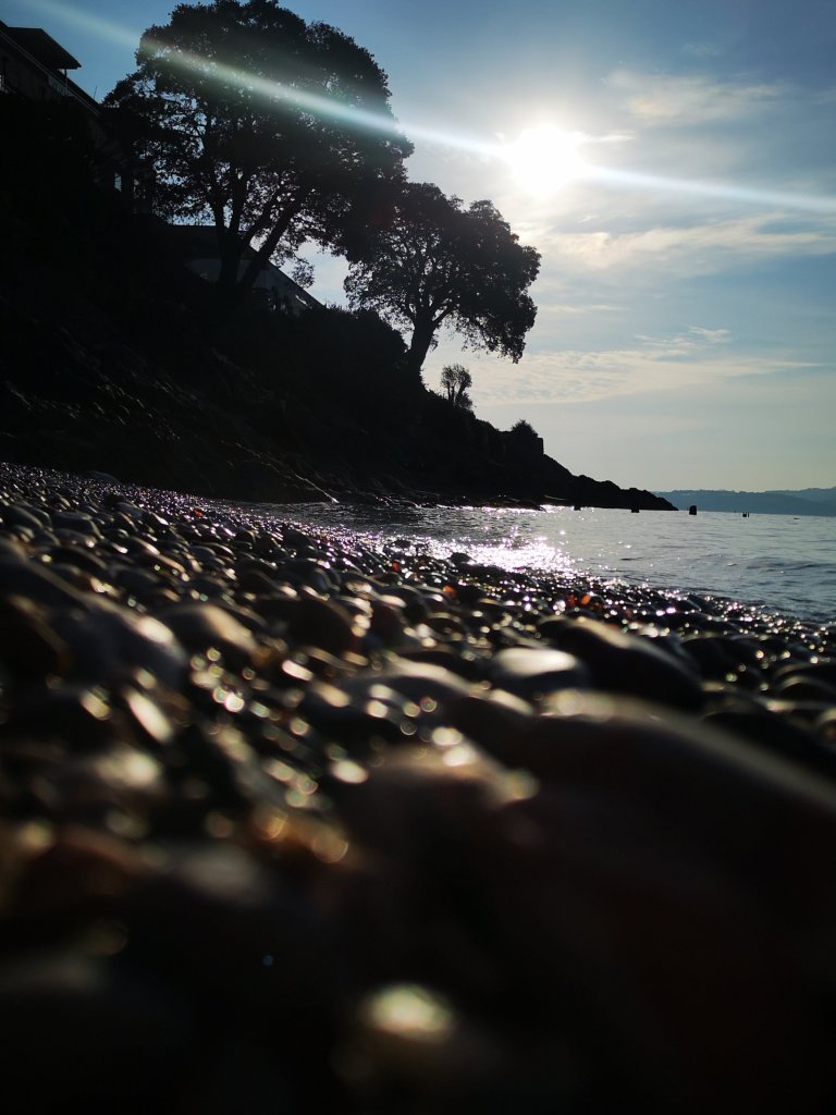 Budgie smugglers and body oil is not exactly what you would expect on a beach in Devon in April but that is what we got on our unfamiliar beach this morning. We also got a good swim and warm sun to heat us up after. We struggled into our usual post swim layers and drank hot drinks, deciding that a drizzle of oil and scanty whisps of Lycra were not appropriate beach wear for bobbers, we will leave that level of hardiness to others. There was something quite eccentric about our swim this morning, the change of location gave me a little inspiration for some micro land art. Making a little tree while the bay echoed with chain saws doing unspeakable things to our familiar trees on the raised path.