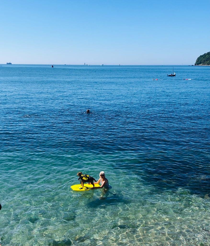 Bobbing with guests. Yesterday was the warmest day so far in 2021. Three guest bobbers arrived for the morning dip. Two with the normal two legs but one with four legs and he bought his own body board.