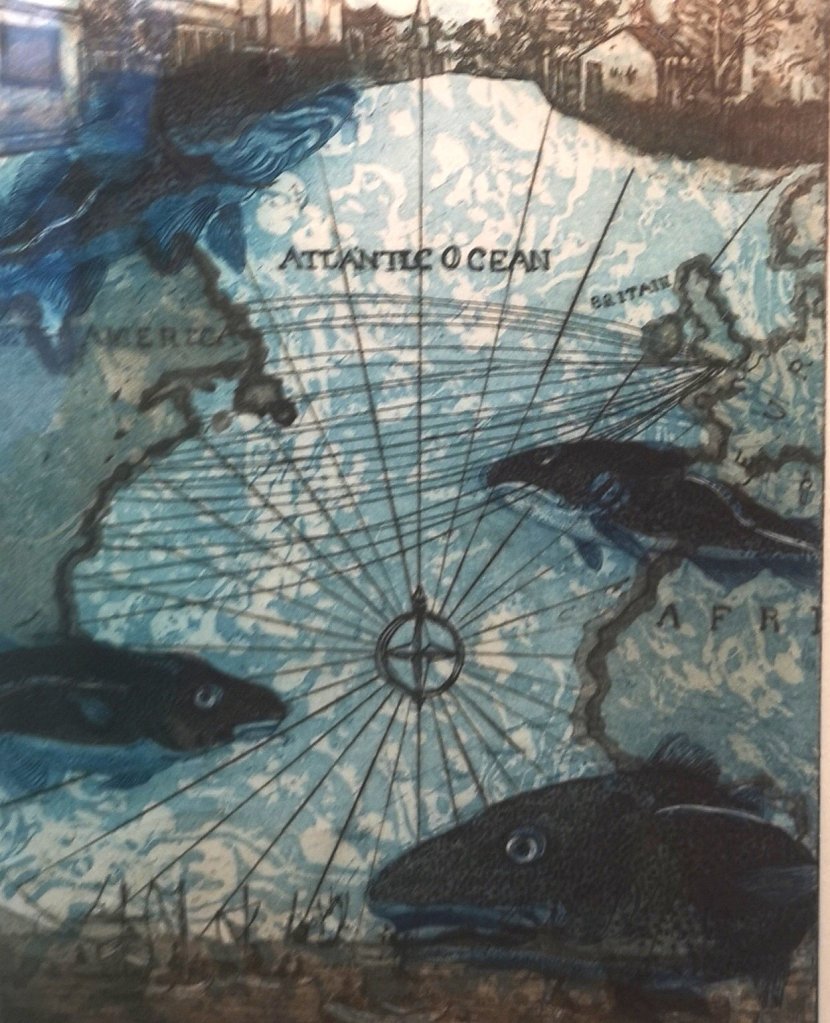 Our trip to the theatre earlier this week was a double treat. Plymouths Theatre Royal holds art exhibitions in the the bar areas in the building. Freshly installed was Journey, a transatlantic collaboration celebrating 400 years since the sailing of the Mayflower. Featuring Printmakers from the Tamar Valley and Cape Cod. Originally planned to be part of the Covid disrupted Mayflower 400 celebrations, this exhibition is a rare survivor of the planned events.