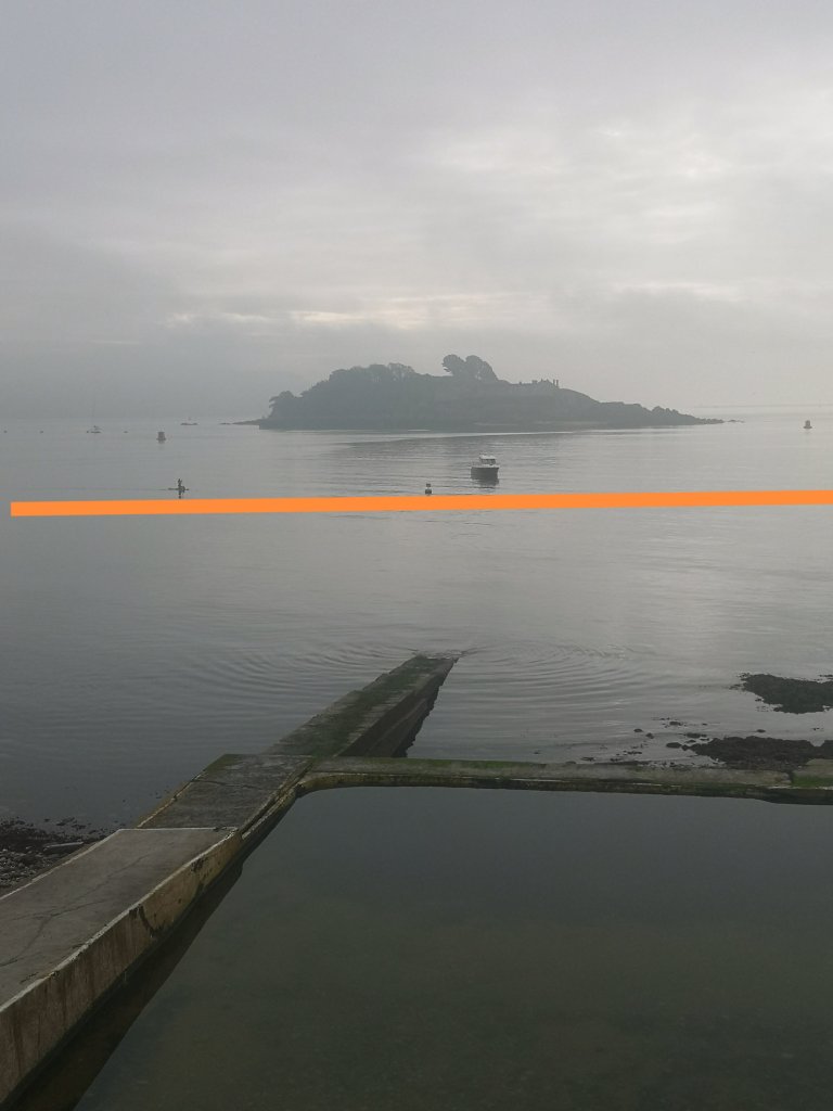 This misty shot shows the geography quite well. Swimmers are permitted to swim out to and along an imaginary line that runs parallel to the island. There is a cheeky fishing boat in the area that is the near the deep water, underwater trench. There were mackerel in there at the time, the submarine came later.