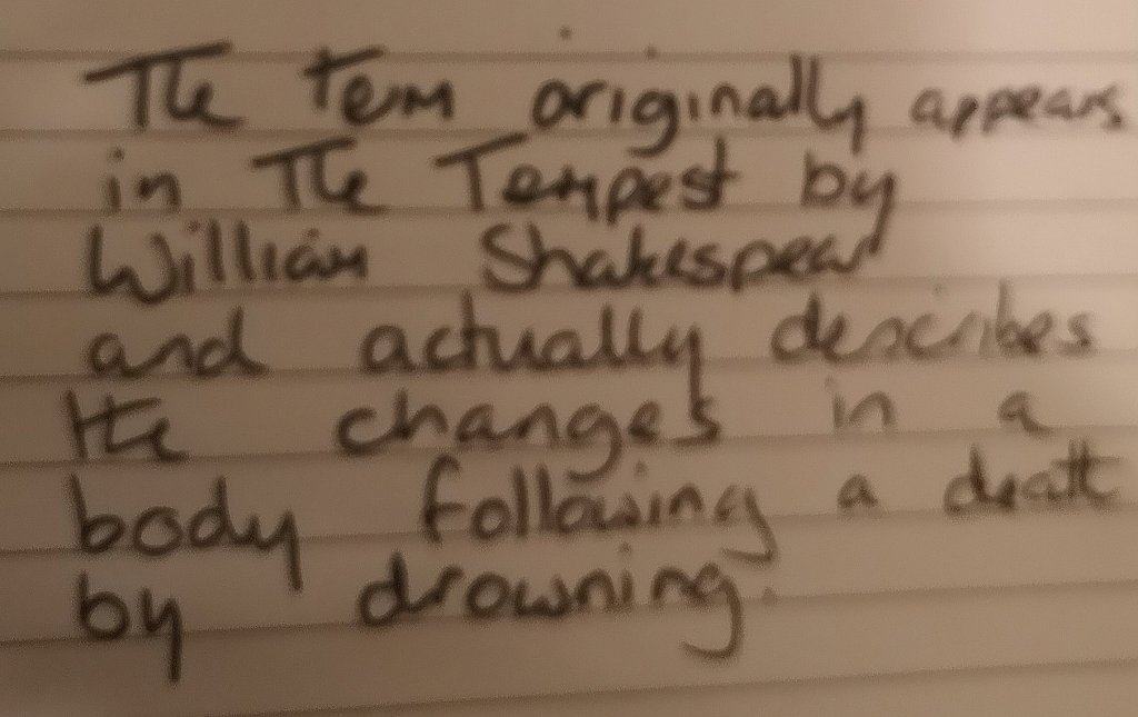 Who could have guessed! I actually prefer my theory, large waves compared to calm waters is infinitely easier on the mind than the changes that occur to a drowned body. Thanks Shakespeare