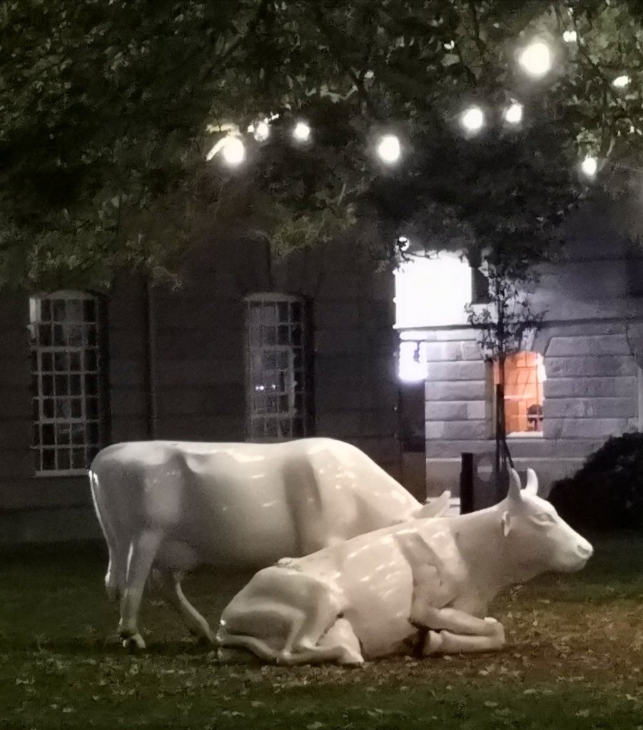It has been complicated. In truth not much has gone on in the last 36 hours apart from wallpapering or thinking about wallpapering. Almost no time to ponder really, especially in daytime hours when natural light was essential to our pattern matching. The new-to-us house is built almost at the top of a hill and runs down the hill northwards and westwards. Such was the diligence of Georgian builders, that to gain the appearance of symmetry and regular shaped rooms some very odd wall angles and floor levels disguise the almost 30 degree slopes in two directions. This does not make wallpapering easy. Dog walking has, of course, continued and, thank goodness for this blog, the night walk is illuminated and interesting. The window above overlooks the green where the dogs like to snuffle, overlooked by model cows and fairy lights..