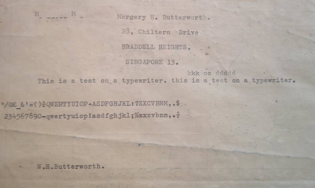 She was generous with her time and knowledge and after reading her blog I felt ready to dip my toe into actually buying a small typewriter. Ebay furnished me with an Olympic Splendid 99.It arrived yesterday, it is very cute. But hidden in its original leather carrying case was a whole little adventure. The original owners Margery H Butterworth and W H Butterworth had typed their address on the Final Test and Inspection Report. My little typewriter was delivered to them in 1960 in Singapore. The power of Google can show me the house it was delivered to.