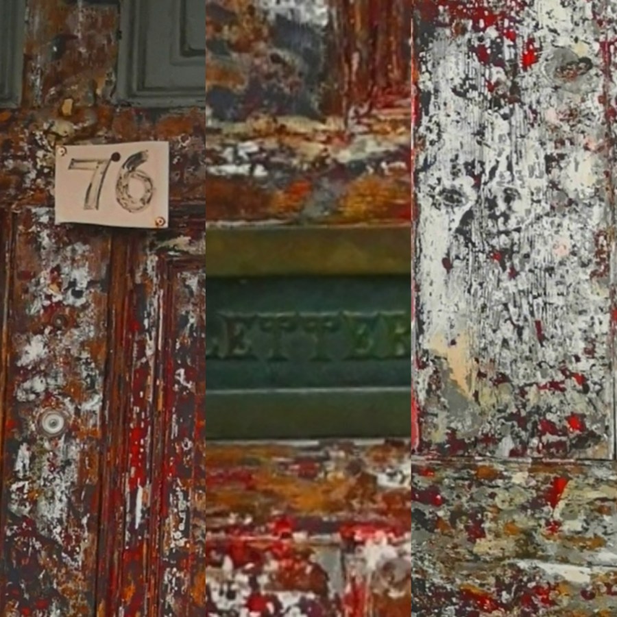 Stripped back ready for refurbishment there is real history in these paint layers. The door could be original and may date back to the 18th century. Once a grand townhouse built some time around 1760, the home has been converted into flats. Stripped of uniform colour it is now obvious that the letterbox was not centrally placed.