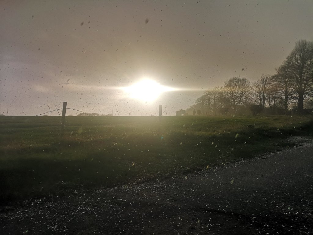 Not what we expected at all. Newly coiffed eyebrows were raised. Getting that cold twice in one day is not acceptable in April. Traffic jam avoided we carried on our journey. Returning to sunshine remarkably quickly.