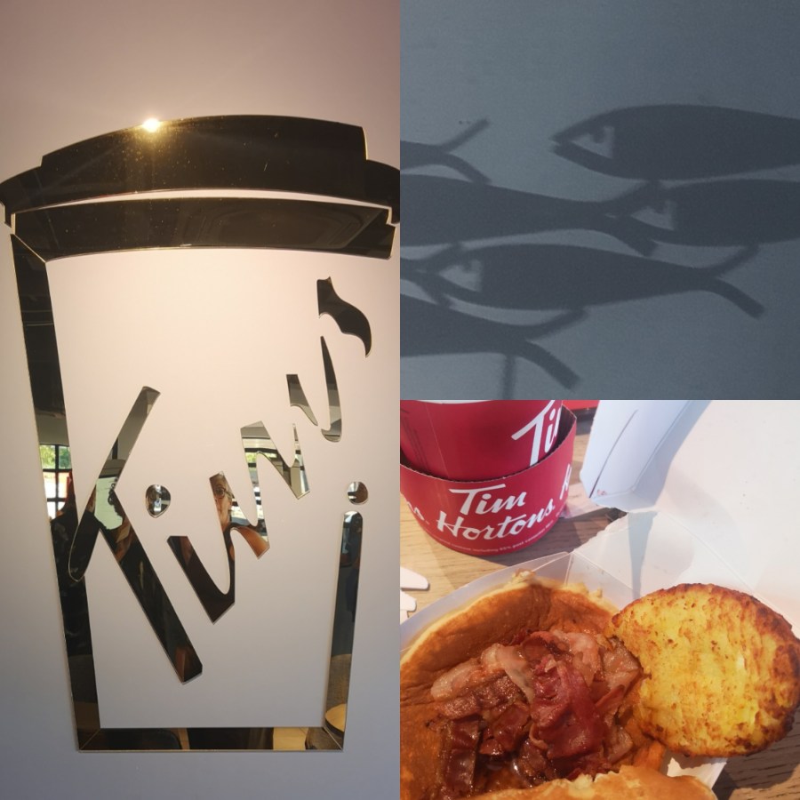 A late blog that is all about the early morning. Our fish sculpture swims across the bedroom wall as the sun rises. And as the sun rose we were up and off to sample a Tim Horton’s breakfast in Plymouth. Tim Horton’s is a favourite when we visit family in Canada.