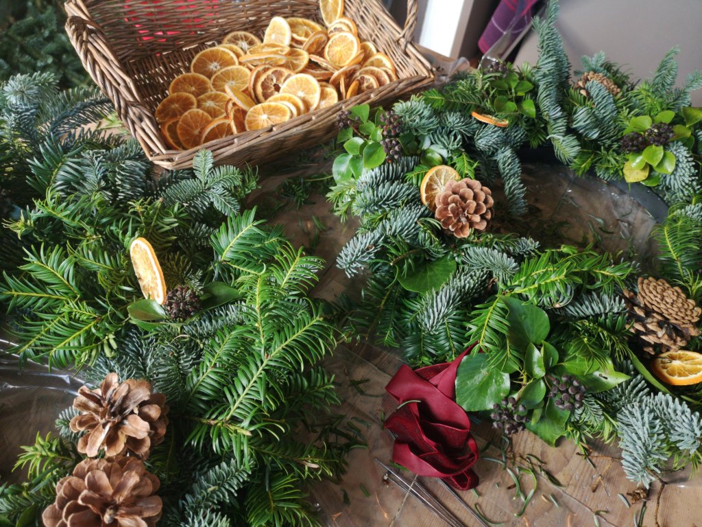 Wreath making is a very fragrant occupation with Yew, Eucalyptus and Spruce as the basis for our creations.