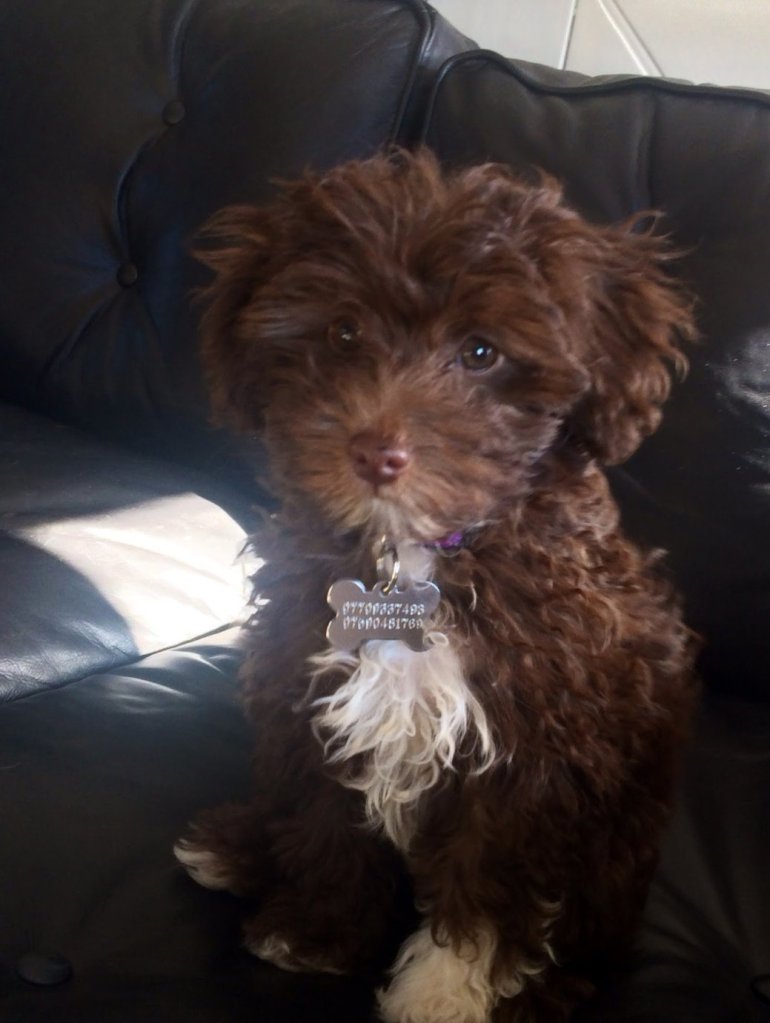 This is the little beige dog that is the constant companion to the lighter, brighter, whiter Hugo. Lola was once a dark chocolate dog with milk chocolate brown eyes. The poodle fading gene has caused her to be a completely milk chocolate dog now, so pale we can barely distinguish her white markings. In every way she has been a fabulous companion to both us and Hugo but the determined little face of that dark brown puppy reflects her true character. Today she was determined to share my chocolate croissant. Her poodle nose poking at the brown carrier bag that held it.