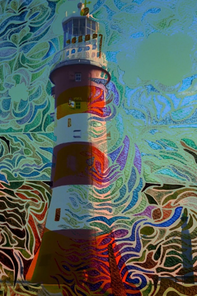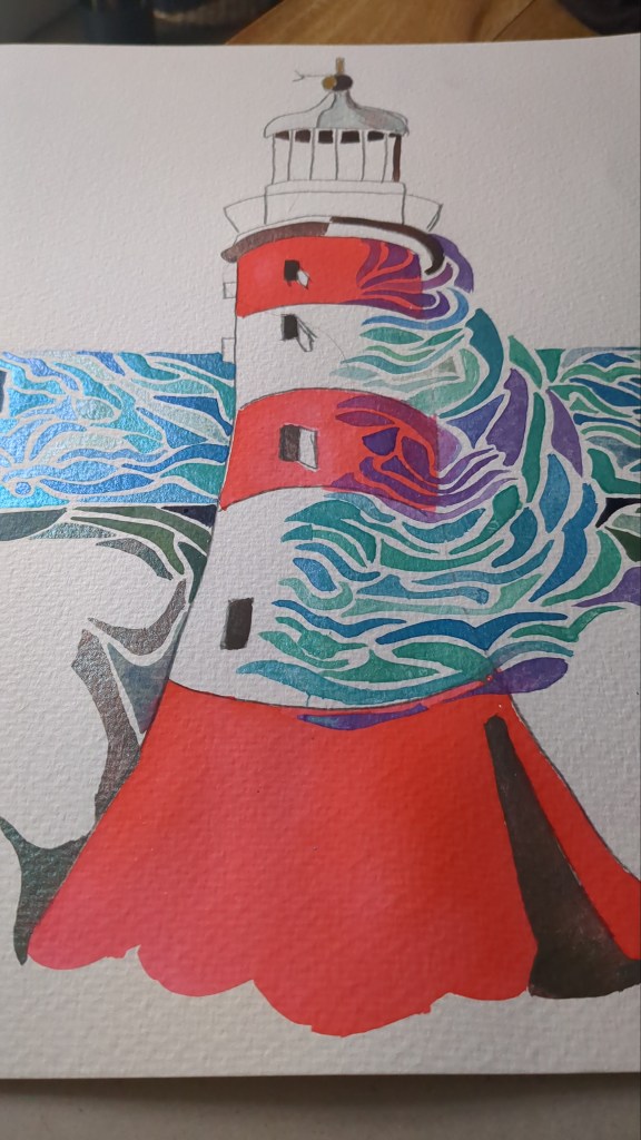 Windy days have an energy about them. From the comfort of indoors the gusts and howls down the chimneys are as close as I get to the outdoor action. I was blown about a good bit yesterday. I wanted to paint wind coming up against something immovable. Smeaton’s Tower seemed like a fairly wind resistant structure.