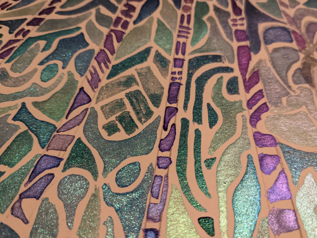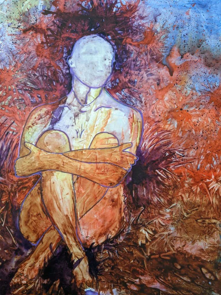A lovely coincidence today when my blogging platform made a title suggestion, I could employ easily. I have often lost myself in painting. Any spare moment in March will be spent creating paintings, prints and cards for a Spring exhibition. While procrastinating I found this unfinished painting in a pile that I had discarded. Discarded because I had painted it on a new paper that I have not used before. The underlying pencil sketch could not be rubbed out and I had discarded it, probably with a touch of grumpiness. More than a year later I covered the pencil marks with some coloured Posca Pens.