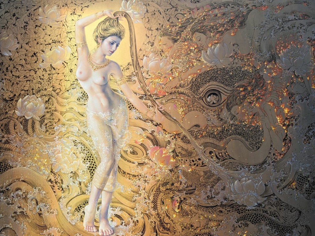 Some images were, to me a little troubling. One, certainly traditional in subject matter, represented young girls, just at pre-, puberty preparing for traditional Thai dancing. What was unsettling to my Western eyes was that so many of them needed to be topless and also, due to the skill of the artist, seem to lock eyes with the viewer.