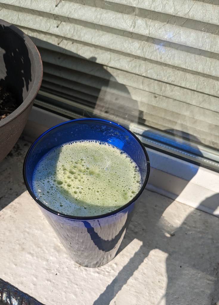 And after the dog walk, breakfast of a spinach smoothie while doing some window-box care.
