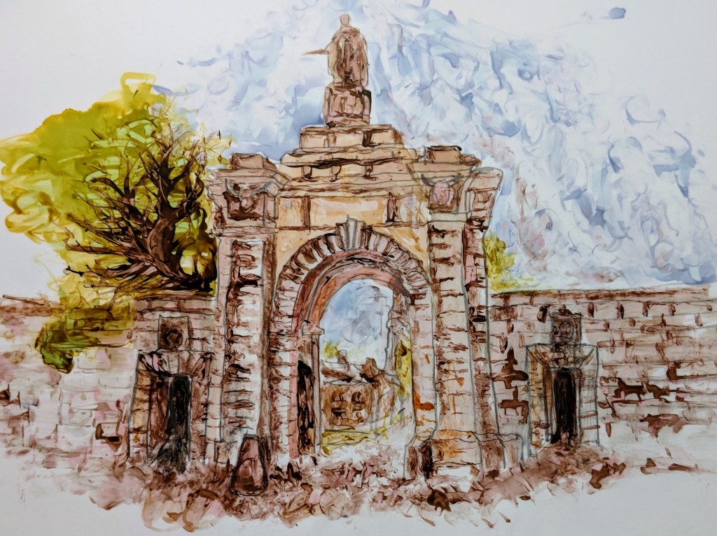 The little sketch above was a favourite moment. Christmas stocks up my painting supplies,sometimes, with new things. Christmas 2022 brought alcohol inks, rubber shaper brushes and Yupo paper. I felt the urge to give them a go yesterday and sketched the gate that I walk through most days for our dog walks. The combination of three new things was a little trepidatious but went well for a first. A series of happy accidents and some angst created a recognisable image. It even looks safe enough to walk under.