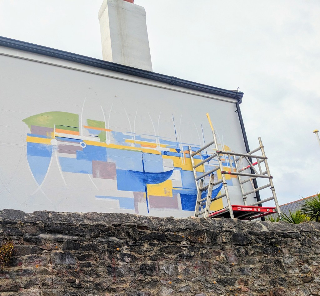 How I wish I had photographed the first sunset without ugly railings but we were too busy discussing the potential of swimming from the slipway once it is extended. So to end this blog there is a ‘ Muriel in progress shot’ too bad I never caught the artist ‘ at it’ Nor do I know the artists name. Things to research this weekend, we may be forced to pop in to the pub!