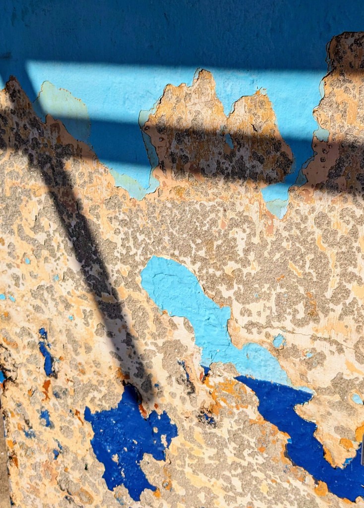 With the return of sharp summer sunshine my morning dog walks are illuminated by sharp shadows. Scaffolding is set up against many of the local houses. Casting abstract shapes on old walls. The air is full of the metallic sound of bolts being tightened by electric spanners and ratchets mixed with music from high up radios, the age and ethnicity of the builder/painter/roofer identified by their choice of music. Sometimes the men working highest up play the oldest music. Surely a reflection of skilled, artisanal roofers being nearer to their pensions than their youth. Even the local church has a mantle of boards and scaffolding poles. The accoustics of the bell tower reverberating with heavy metal and dance tracks. Possibly the most fun the tower has had in a long time as I have never heard a peep from a bell or anything else in the tower since moving here two years ago.