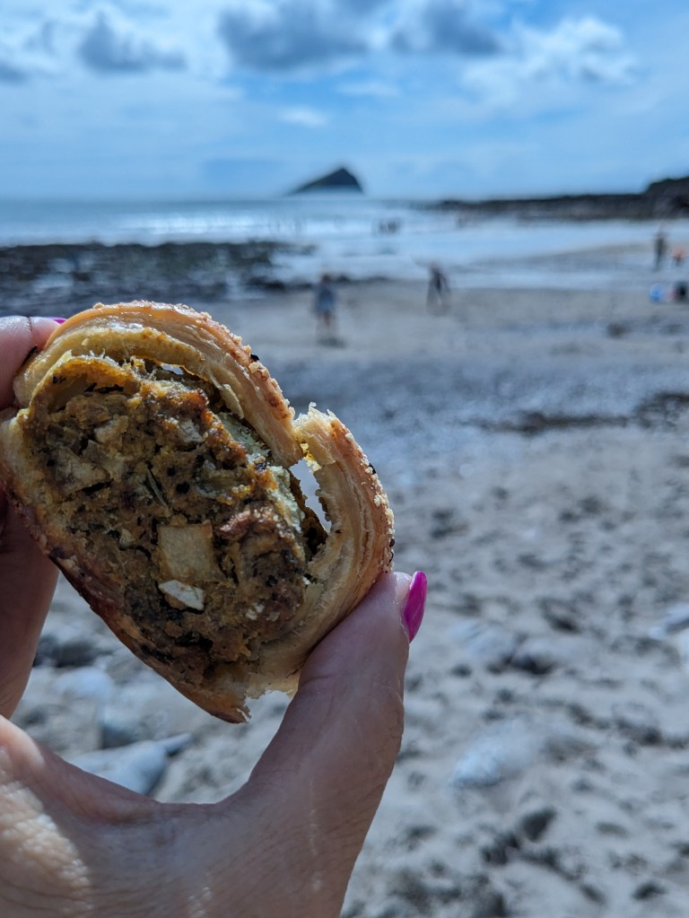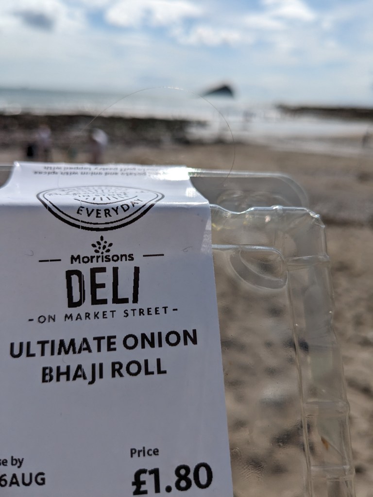 Here I am on my regular, dog grooming day, spot. Wembley Beach on a day with sunshine, the first day of good weather for weeks. To celebrate I bought an unusual but gorgeous snack to accompany my habitual cup of tea.