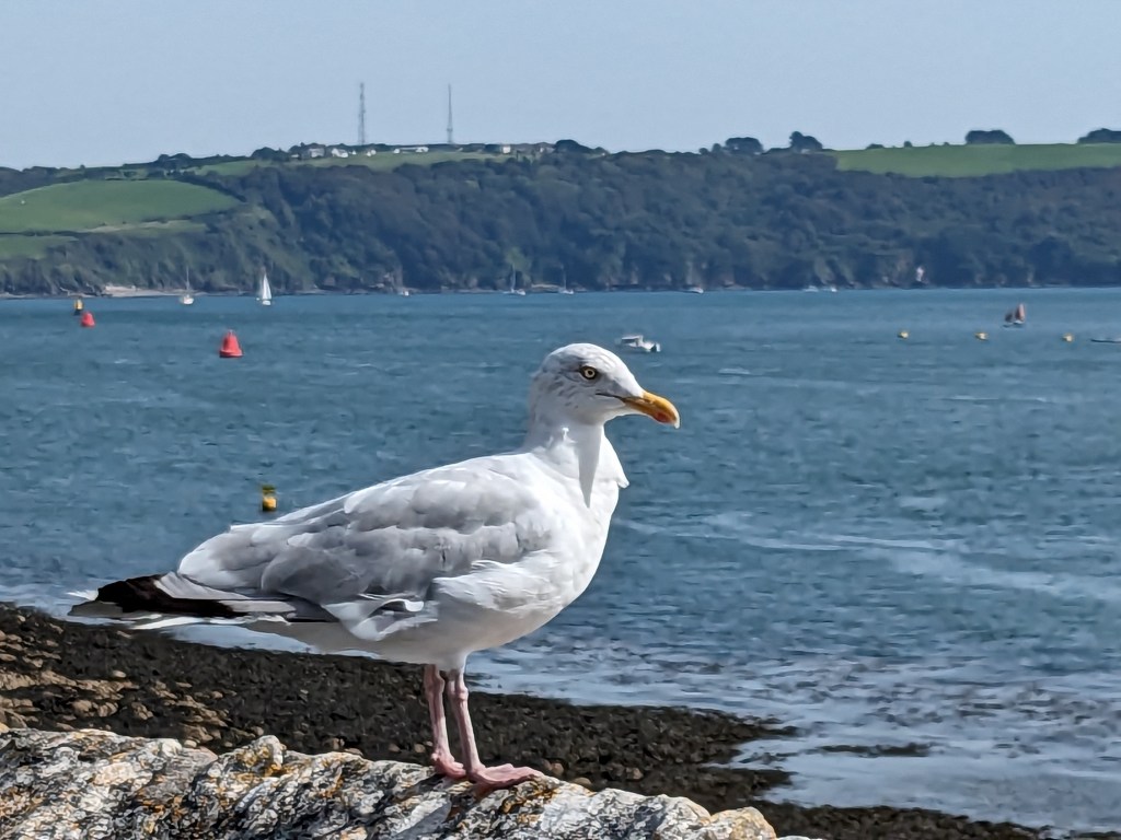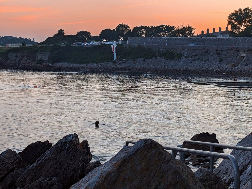 Although this looks blissfully peaceful there was an annoying drone flying overhead. The drone operator may have felt irritated by me bobbing about when all they wanted was an empty bay. The sea had been full all day of people making use of our hot September weather and my isolated dip was just good timing. There were plenty of people still in the water 15 minutes before when I walked the dogs. There was also some live music coming from the Tennis Club that overlooks the bay. It is just too bad that we didn’t have good weather when the evenings were longer and we had friends and family to fill them with. Regardless, an evening swim was very relaxing. The water was crystal clear and beautifully black, mind clearing in the best possible way.