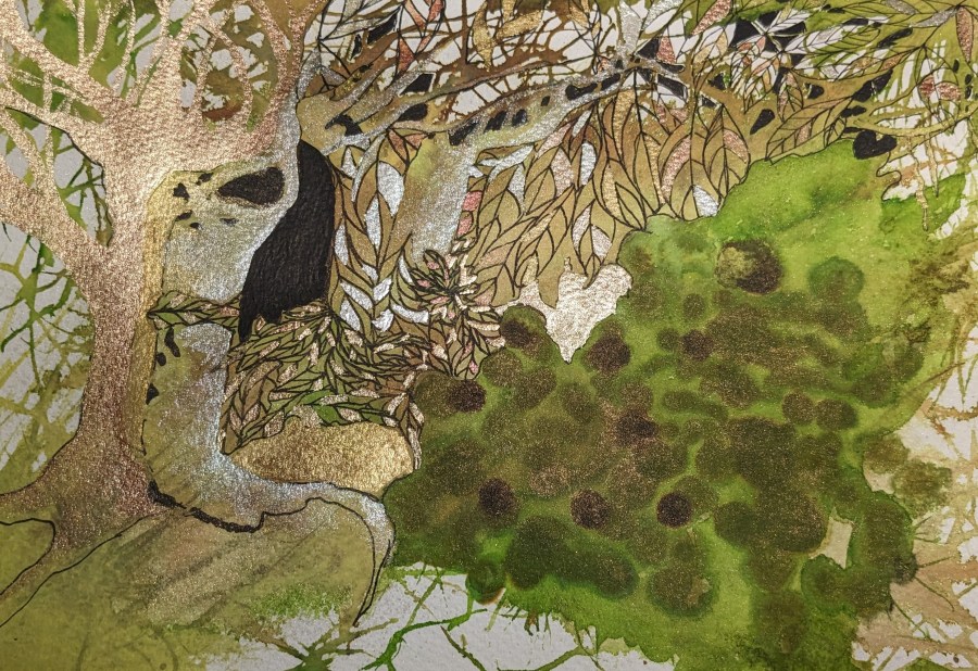It has a long way to go but I already know the painted boulder would be a comfortable place to rest and the glade is becoming more fantastical by the brushstoke.