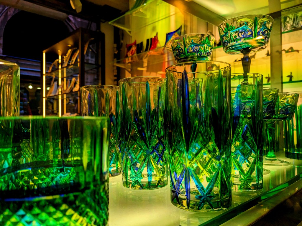 After a few days in Venice, where this Chandelier twinkled for us, we had seen more coloured glass than was good for us.
