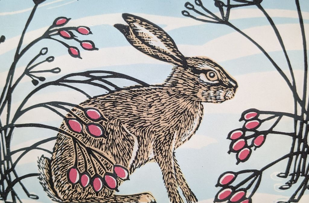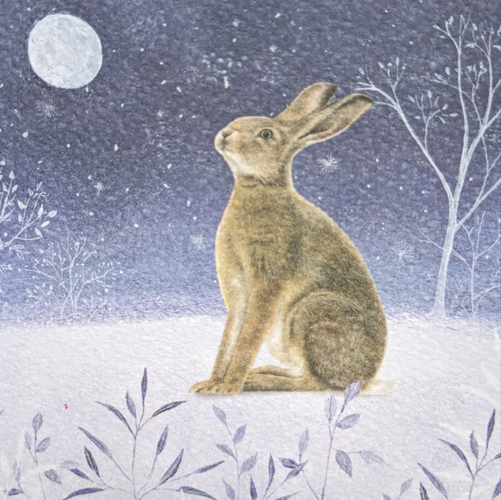 I am drawn to Hares, there is an elegance about a hare that a rabbit simply doesn’t have. The elongated body and oversized ears give them an unmistakable profile on the very rare occasions when they are seen out and about. Hares were a popular subject on Christmas cards that we received this year.