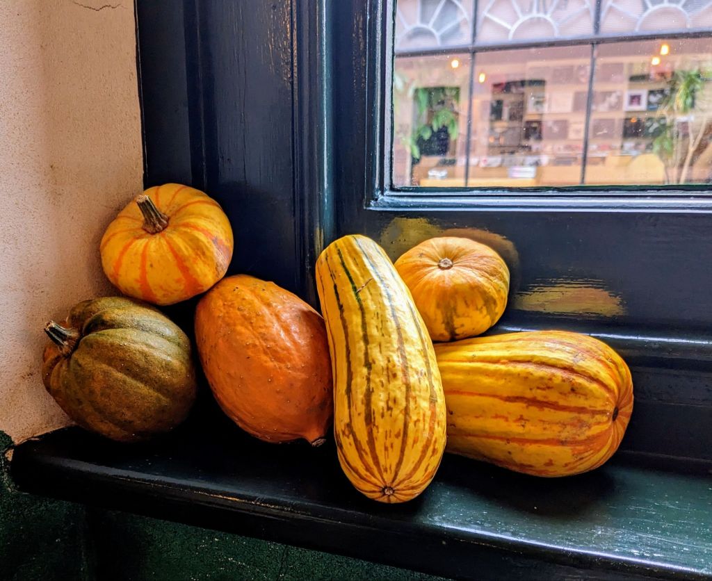 Gourds on a window ledge in Totnes made a cosy corner on one of our out of town excursions.