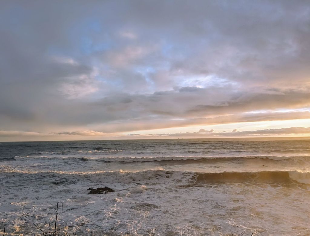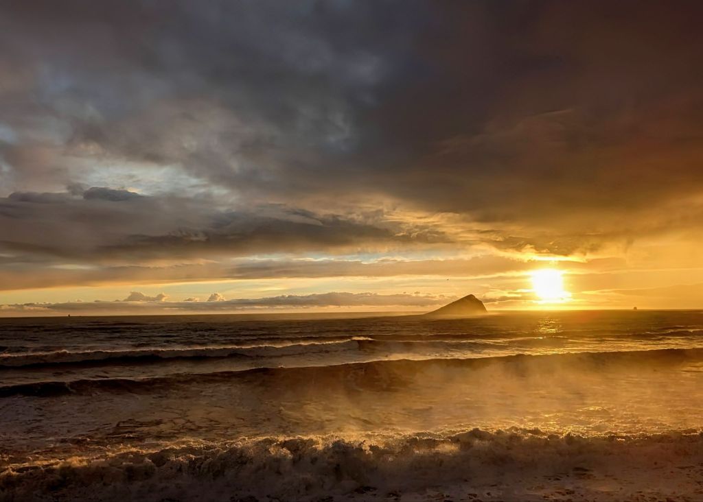 Yesterday was one of those repetitive blogging days when I do a regular activity. About once every four or five weeks, our dogs go to the groomers in Wembury and I get three to four hours to do whatever I want. Unhindered by the needs of two dogs. Sometimes I get on with regular life admin but mostly I take myself to Wembury beach which offers a variety of me-shaped entertainments. A Coffee shop, an excellent swimming beach and the South West Coastal path in two directions. Yesterday was a little different as the weather was shocking and I had driven through a flood to get there. There was no phone signal and the rain was drenching. I had one essential task that could be performed in the local Post Office. Beyond that it was just book reading in the campervan with cups of tea from a thermos flask. Hardly the stuff of blogging gold. But the weather and tides had other plans for the day. The header photograph is not black and white but exactly as the coast presented itself on arrival. The wind was a warm, but strong, south westerly and an abnormally high tide was due at 5pm. In no time at all our little brown campervan had many friends in the car park. Campervan’s and regular vans bringing hoards of excited surfers to the beach. Maybe fifty vans being unpacked by rubber clad enthusiasts eager to make the best of the day on their boards. I watched from the comfort of the van and the hours passed, but soon enough the tea had worked its way to my bladder and I decided to walk to the public loo rather than use our onboard facilities. The power of the sea was amazing in a relatively small bay. The surfers or the weather had brought many onlookers who, just like me, stood on the cliffs and watched the spectacle of nature and the little black specs who were riding the waves. The sunset coincided with high-tide and nature threw out a light show to end the afternoon.