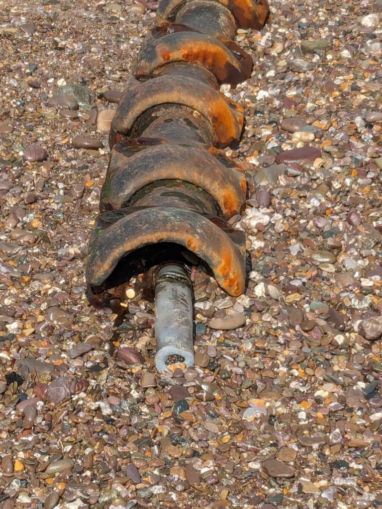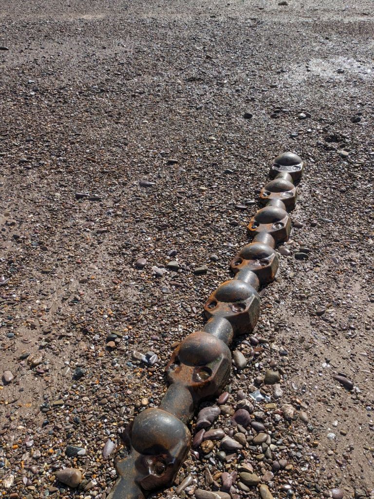 This is the second Sunday that the sun has come out and our second time, this week, on a beach with a super-low tide. This time a rusty object was revealed.