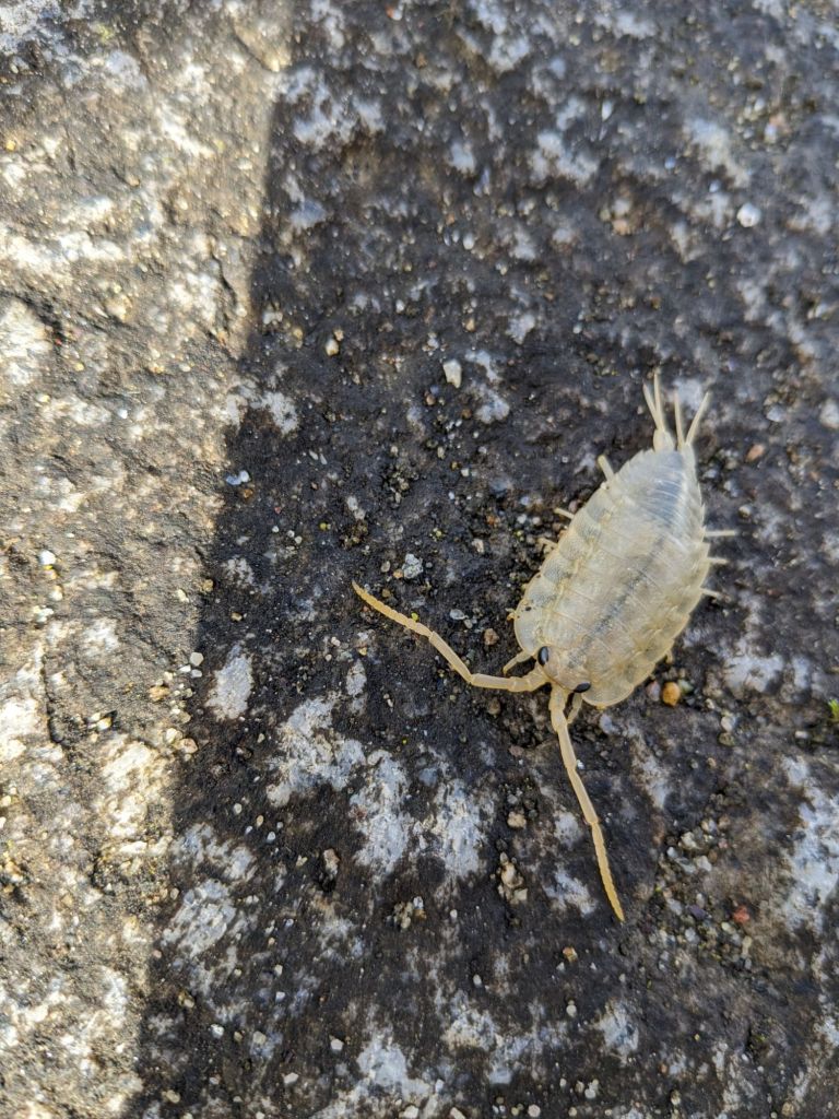 Which involves a large bug . You can’t possibly know that he was a large bug because I failed to put another object in the photo for scale. He was probably as long as a finger. Google lens tells me he is a Bilge Bug or Sea Slater and he lives in the littoral zone. Bilge bugs live for three years. Every day is literally a school day.