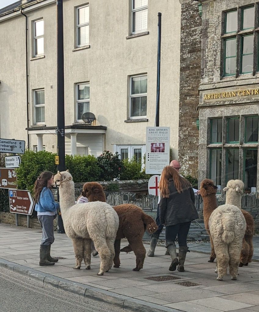 The early morning, which is when most blogs are written, is perhaps the most unchanging time of day. So with some confidence I can say that in ten years time I will be performing my early morning ritual. Tea followed by coffee. Where I will be doing it is quite another matter, one that is completely unpredictable. But life is unpredictable even in the short term. Even one minute before seeing these Llamas there was no expectation of a Friday afternoon llama encounter. We were in Tintagel, North Cornwall. Home of Arthurian legend.