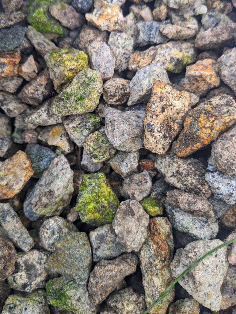 Don’t we all take risks from time to time? Carefully judged most often but sometimes not thought out at all. Yesterday, I was tired after a few hours of computer work. I decided to sweep the yard, clearing all the moss dropped by nest-building birds. In doing so I knocked some rotting wood from a raised bed, full to the brim with these small rocks. Should I remove all the wood and accept the consequences?