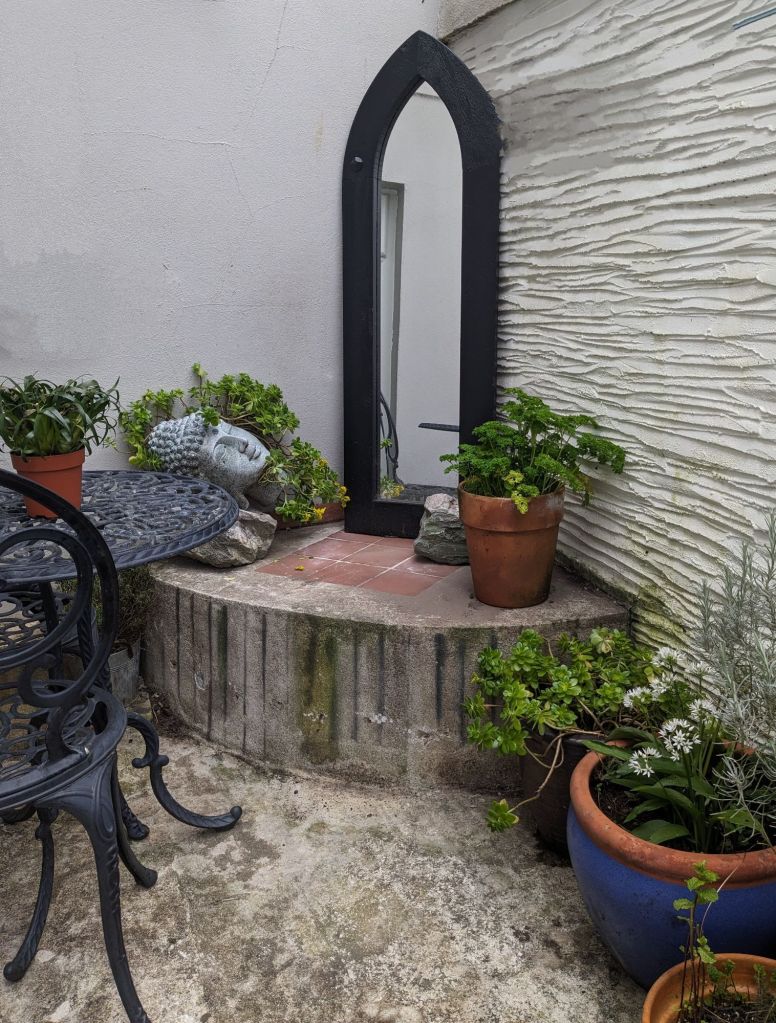 Currently not a thing of beauty but nothing a power washer can’t sort out. I am somewhat perplexed as to why anyone would turn this into a stone-filled raised bed. But my tiny bit of risk taking paid off. I don’t even want to know what the concrete is hiding. We will sit here in the sun oblivious to the mystery.