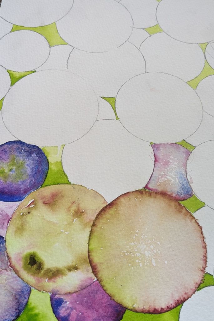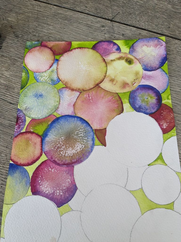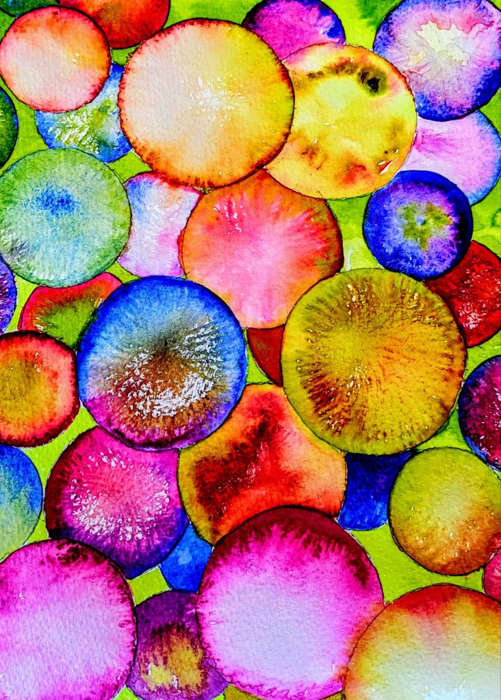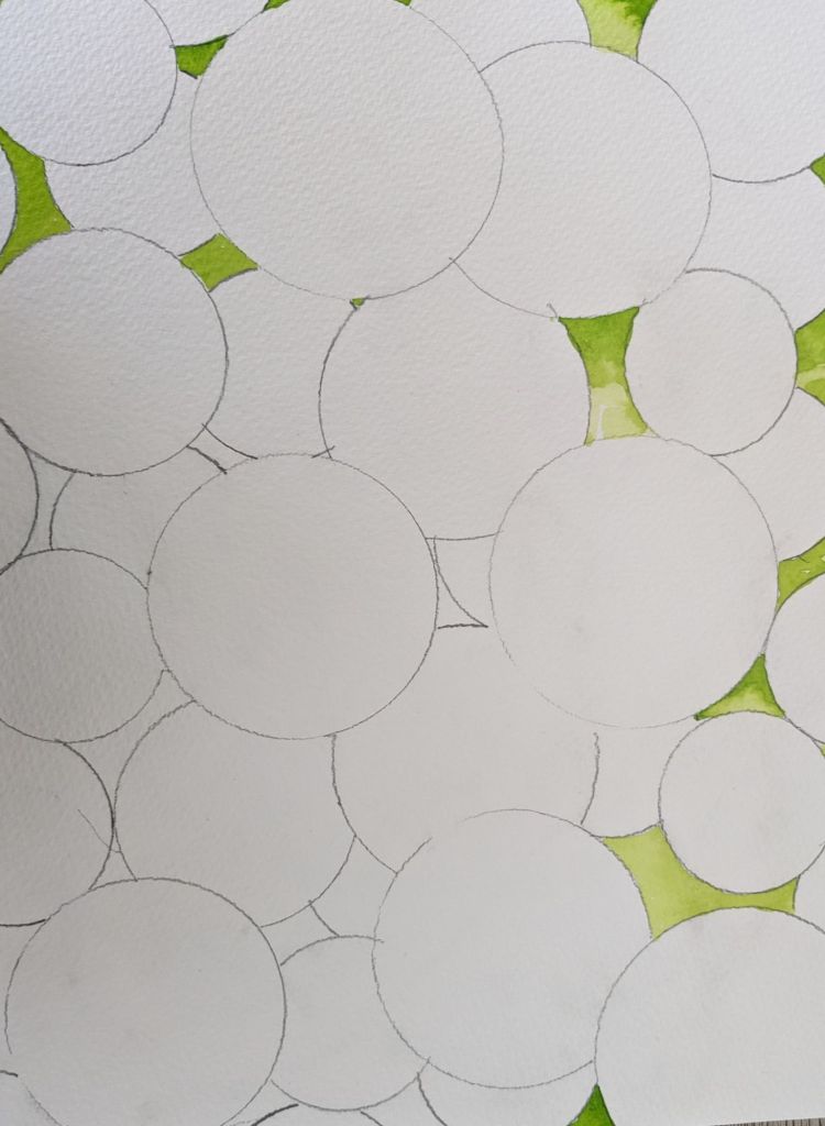 Why mindful painting? Just 3 colours mixed any way filling predrawn spheres. Easy to do while my mind and nattering were certain to be running away with me.